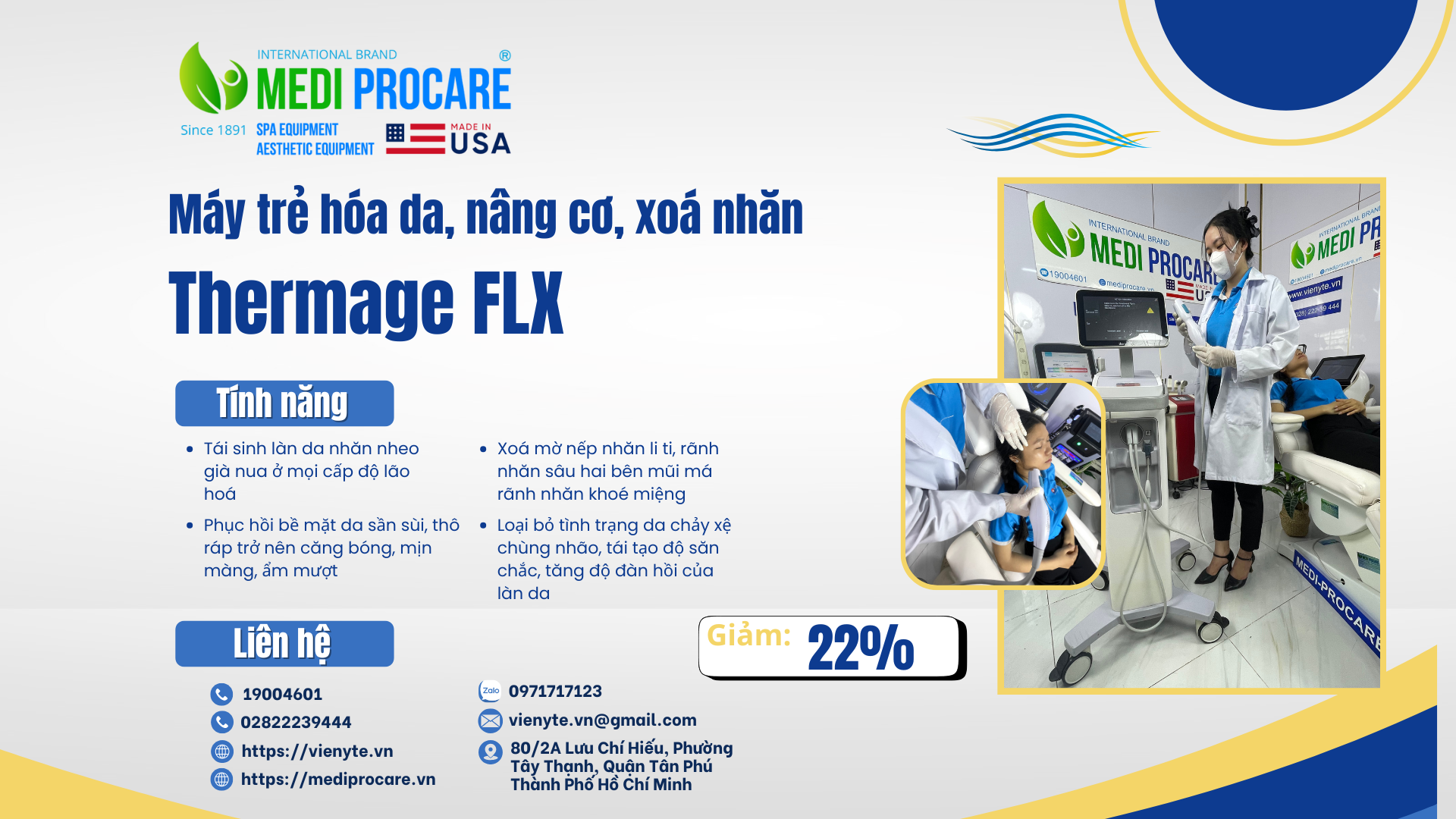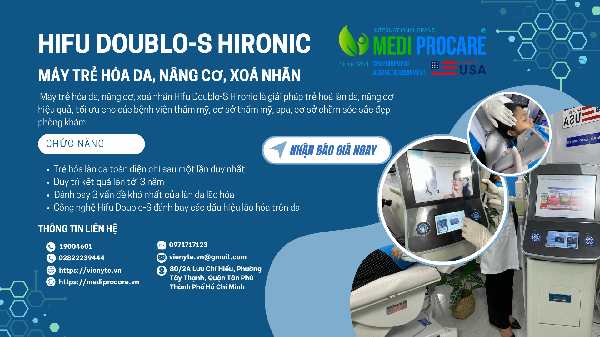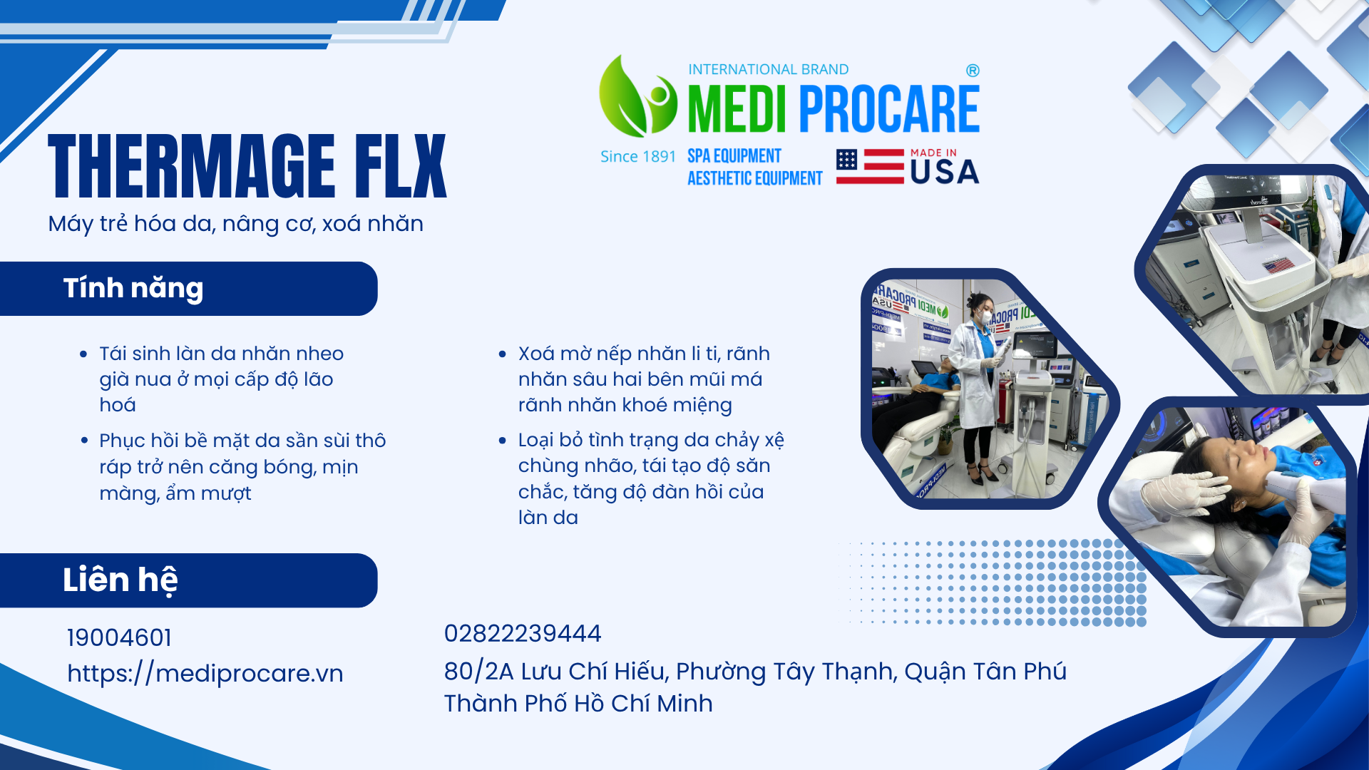 Về lịch sử: Thành lập từ năm 1891, hiện MEDI-PROCARE sở hữu hơn 118 chi nhánh toàn cầu, cung cấp giải pháp chăm sóc sắc đẹp đạt chuẩn y tế.