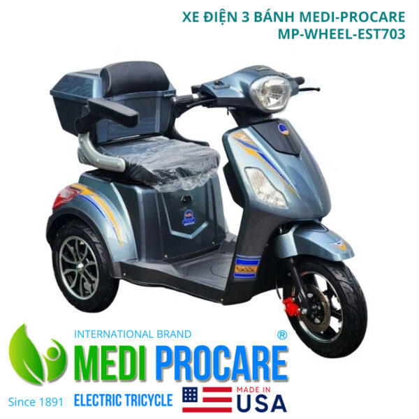 Xe điện 3 bánh, xe ba bánh điện, xe máy điện 3 bánh giá rẻ cho người già, người khuyết tật MEDI-PROCARE MP-WHEEL-EST703 là dòng xe ba bánh điện cao cấp, được sản xuất theo công nghệ hiện đại của Hoa Kỳ.